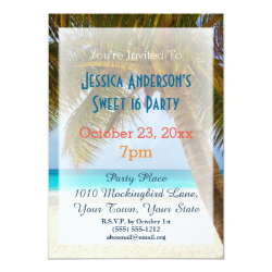 This Sweet 16 Birthday Party invitation features an elegant summer beach theme and palm tree design. This item is shown on standard paper, but can be customized to any color paper you wish. There are many options for personalization! Enter in your own information, or customize it to remove any element you desire. Great for an elegant event and is sure to wow your guests.